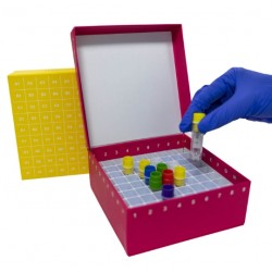 CRYOKING 2 INCH 81 WELL WATER RESISTANT ID-COLOR™ CARDBOARD FREEZER BOXES WITH HINGED LID AND DIVIDER MADE OF ABS MATERIAL.