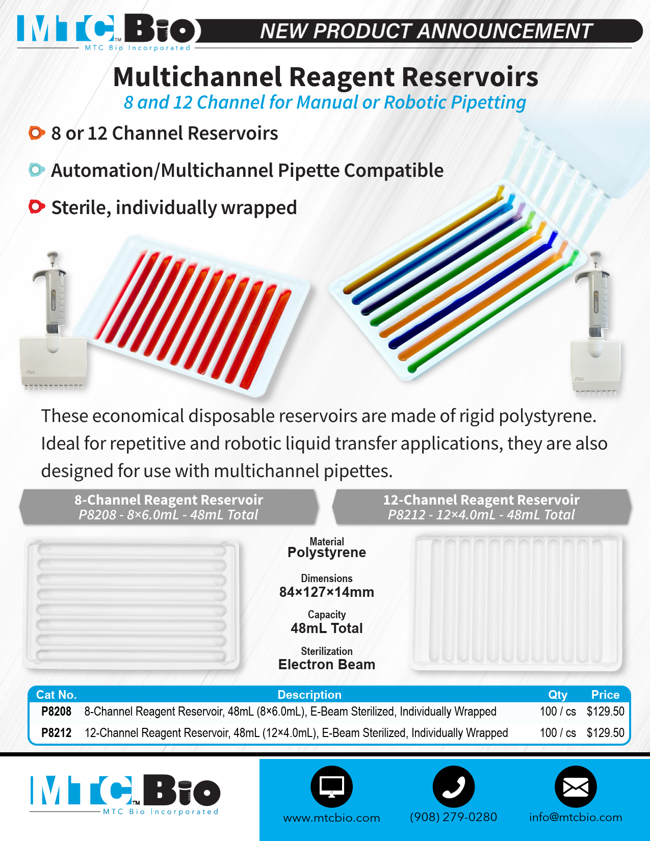 P8212 Solution Reservoir, 12-Channel, 48mL (12 x 4.0mL), 84 x 127 x 14mm, E-Beam Sterilized, Individually Wrapped, 100/cs