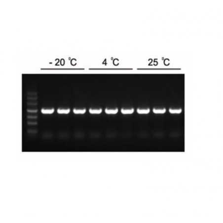 The Master Mix was stored at -20°C for 1 year following another 3 months at 4°C and 1 month at 25°C. Template: Arabidopsis genome. Annealing temperature: 60°C. Extension time: 40 sec.